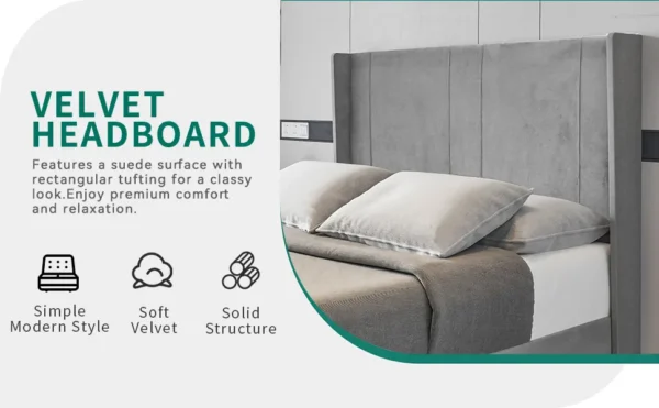 - VELVET HEADBOARD – The king size bed frame features a suede surface with rectangular tufting for a classy look; The wingback design ergonomically fits the human curve with no box spring needed; Enjoy premium comfort and relaxation.
